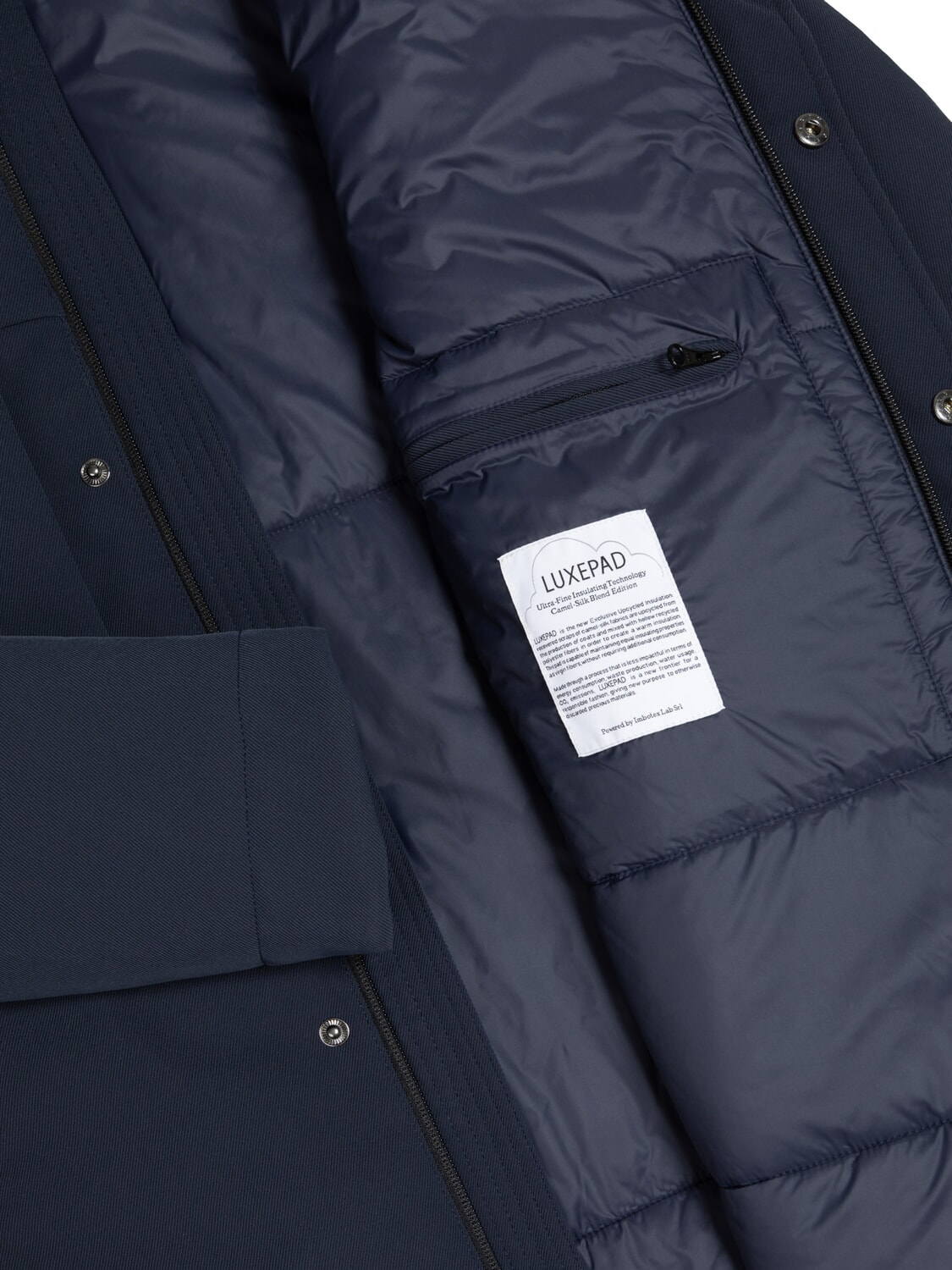 Materiale imbottitura: ovatta LUXEPAD ottenuta dal recupero di pelli di cammello e cappotti di seta rilavorati, miscelata con fibre riciclate